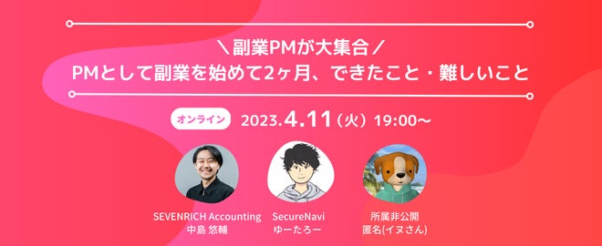 参加者の皆さんから事前に寄せられた気になる質問についても、可能な限り答えるので、聞いてみたい話題がある方は、ぜひぜひ参加申し込み時のフォームに記入いただけたら嬉しいです。現在PMとして働いていて副業に興味がある方はもちろん、今後のキャリアとしてPMに興味がある方へも参考になる話を聞ける会にしますので、お楽しみください。
